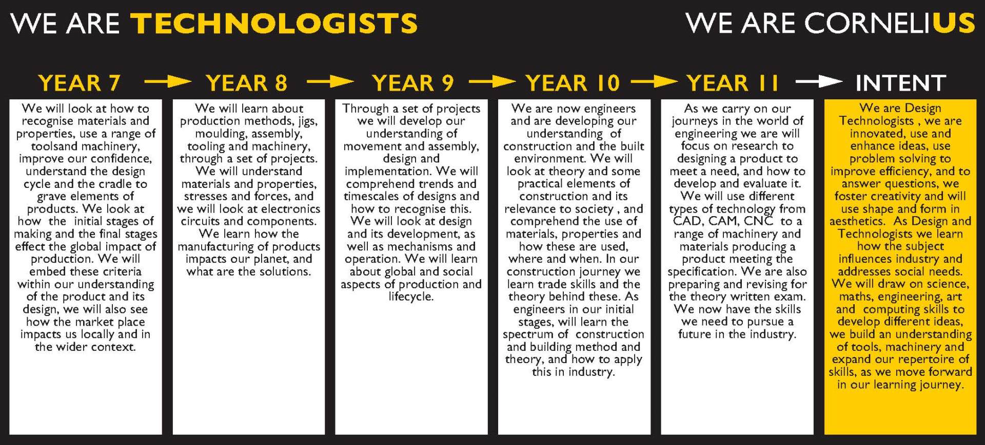 Design cycle, wider global impact, social and moral relevance, materials and properties, structures and forces, sketching and rendering, CAD and CAM, product assembly, prototypes and method theory and process, feedback and response. | Iterative design and methodical process, showing good comprehension of concept and the wider impact, quality construction and finishing, clear connection of challenge. | Through teacher assessed regular guidance and marking templates and comment. |