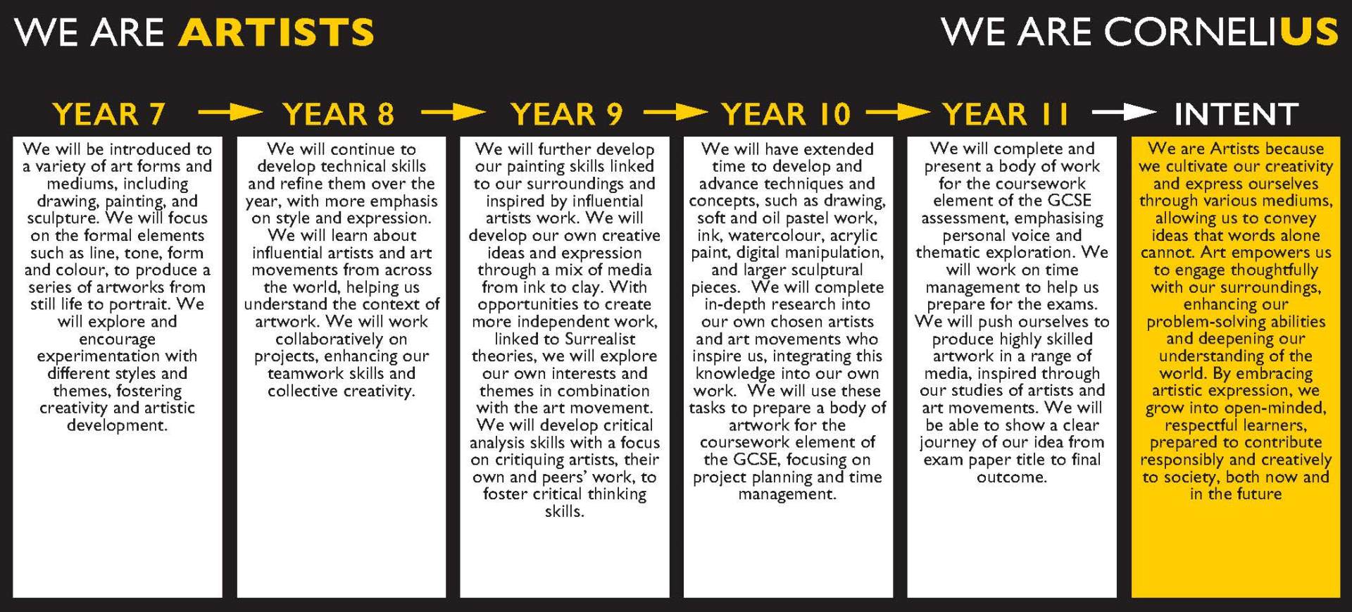 Students will learn to look deeper at a given title, responding creatively with materials and ideas. Students develop photographic skills linked to Leading line, Rule of thirds, Photoshop – Layering, Macro Students will build and refine their ability to link materials to an artist/art movement, developing their knowledge and ability to analyse artist work to produce an image based on Formal Elements. | A student that consistently demonstrates the ability to control materials with confidence. A student that shows understanding of artists work through concise and insightful annotations. An ability to connect ideas and draw comparisons from artists studied, techniques and medias used. An ability to present ideas, photographs and development through a highly creative portfolio of work. | Each media used (pencil tonal drawing/ acrylic painting/pastel study/etc.) will be graded by the teacher at regular intervals, feedback is provided in a written sheet kept with students portfolio. The final outcome for the project will be graded and stored on Google Drive. |